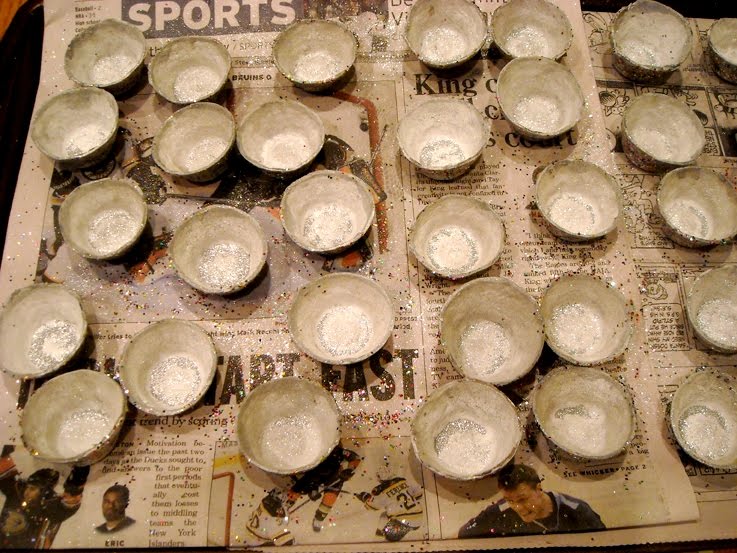 I set these in the garage to dry and once done I sprayed them with a sealer. When the sealer had set, I flipped them over and spritzed the inside with some craft glitter spray (from walmart).